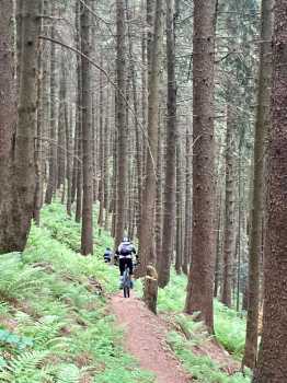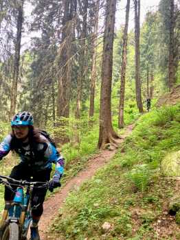 Si riparte subito all’insegna del sempre valido FBL (fà balà l’öcch) su una serpentina di vivaci tornantini che portano a Malga Palmarusso. Da qui tratto giù lungo scoscesi pratoni che fanno correre le nostre bici in scenari stupendi. Da Casentiga ecco che parte l’attesissimo sentiero dell’Uccellatore, novità di stagione che in quanto a scenari e divertimento ci fa letteralmente sognare. Ci ritroviamo in un’abetaia da fiaba dove tutto è perfetto. Un favoloso sentiero flow come mai visto prima, degno di un documentario di David Attenborough. Provare per credere. Che spettacolo!