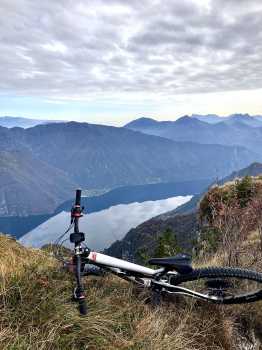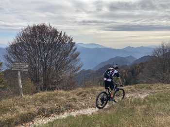 Ci attende la cresta col suo singletrack a tratti esposto e alcuni saliscendi che ci obbligheranno a pedalare. Il primo tratto di discesa lambisce la parte di bosco e si presenta subito proibitivo per i più. Servono doti trialistiche non da tutti su tale pendenza e terreno scavato sdrucciolevole. Optiamo per la conduzione a mano del mezzo, pochi metri dopo il sentiero rimane stretto, ma si fa via via più docile e divertente, fino a condurci nel fitto bosco, parte in assoluto più divertente da guidare. Sentiero vario, mediamente tecnico a tratti con qualche lieve rilancio, alternato a tornantini e tratti veloci. Ci godiamo il divertimento fino a un bivio che corrisponde col termine della cresta. Ignoriamo le indicazioni per Lodrone/Ponte Caffaro, svoltando a destra, direzione Sant’Antonio/Anfo.