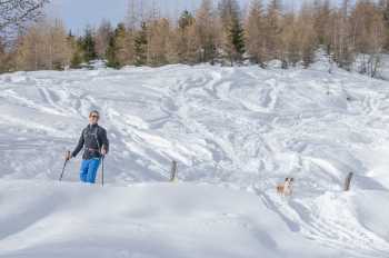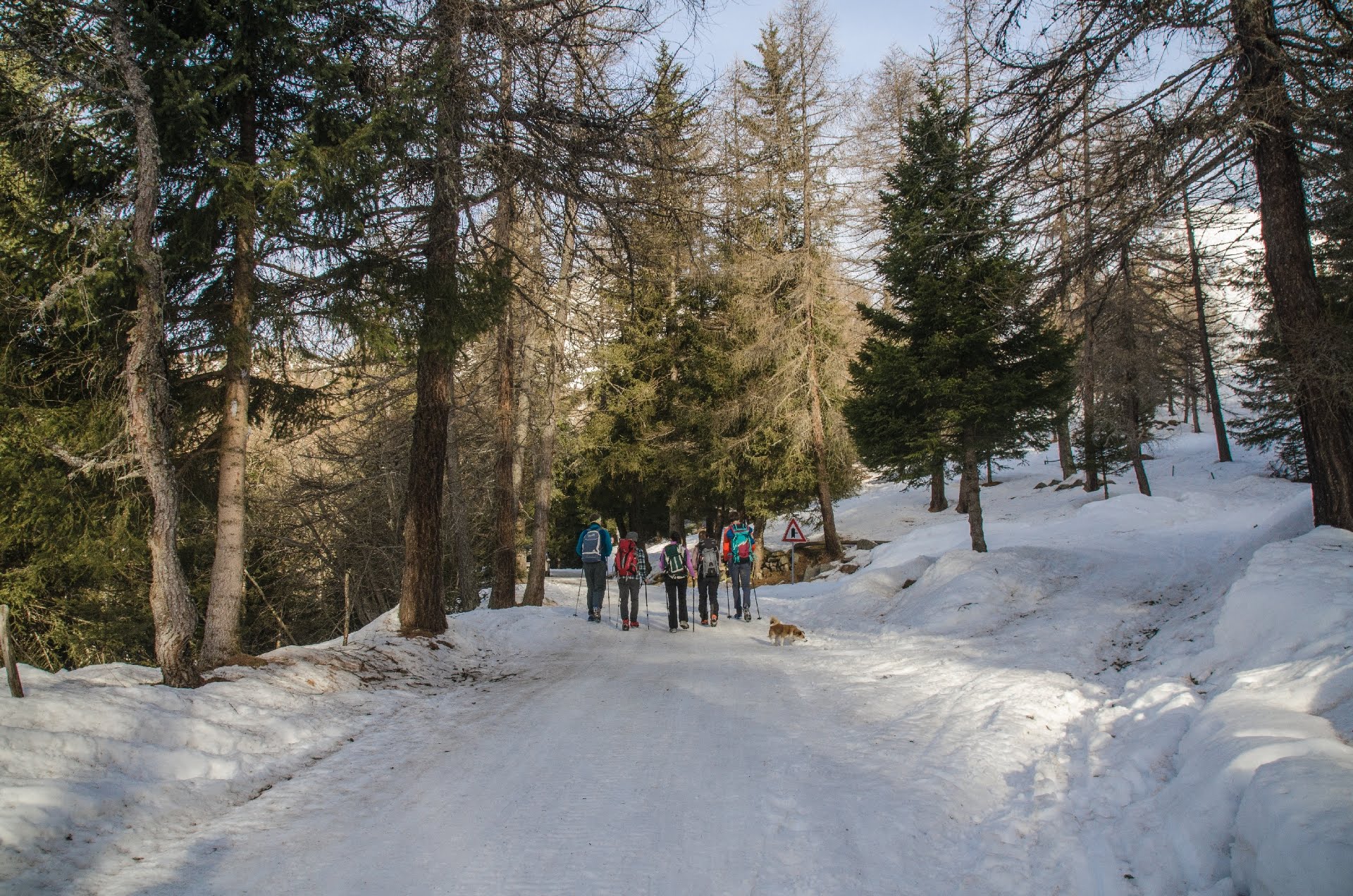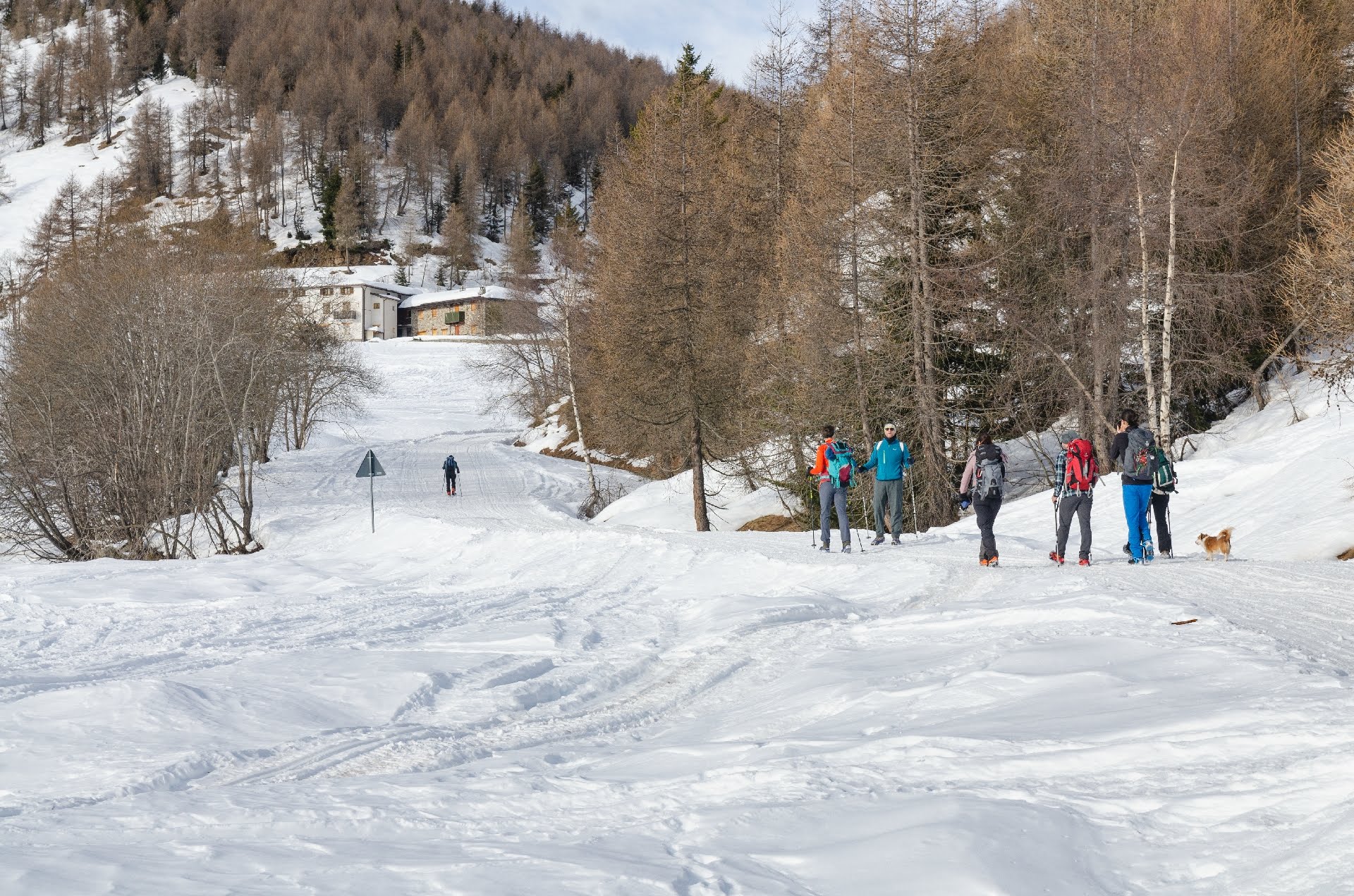 Partiti dalla vecchia mulattiera dopo l’abitato di Monno (BS), risaliamo lungo la vallata, fino a immetterci sulla strada provinciale 81 innevata, che risaliamo fino a giungere al Passo del Mortirolo (1882m), scenario di mille epiche battaglie ciclistiche.