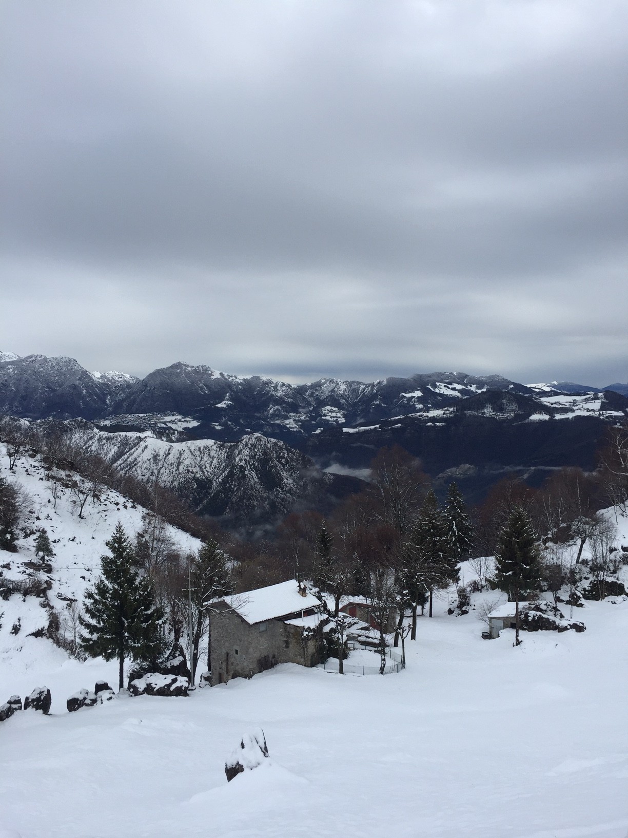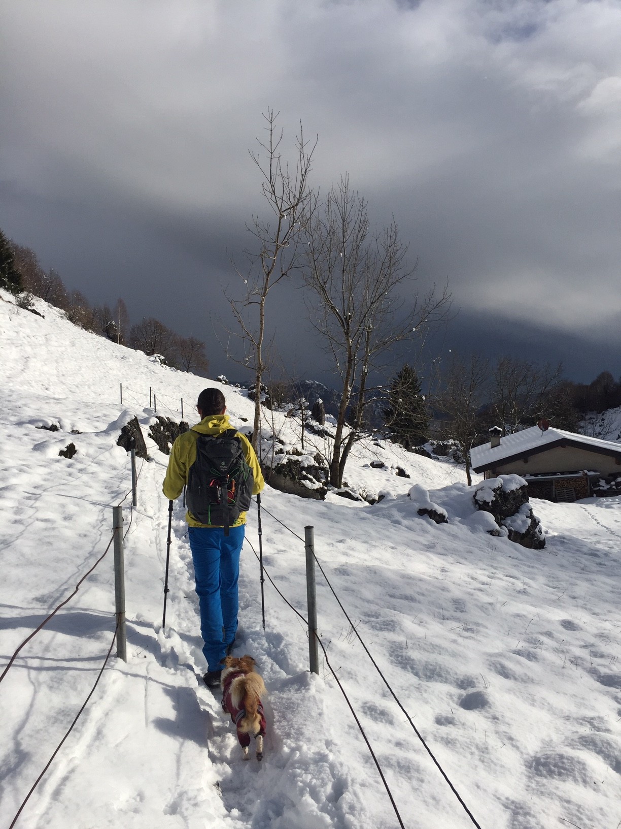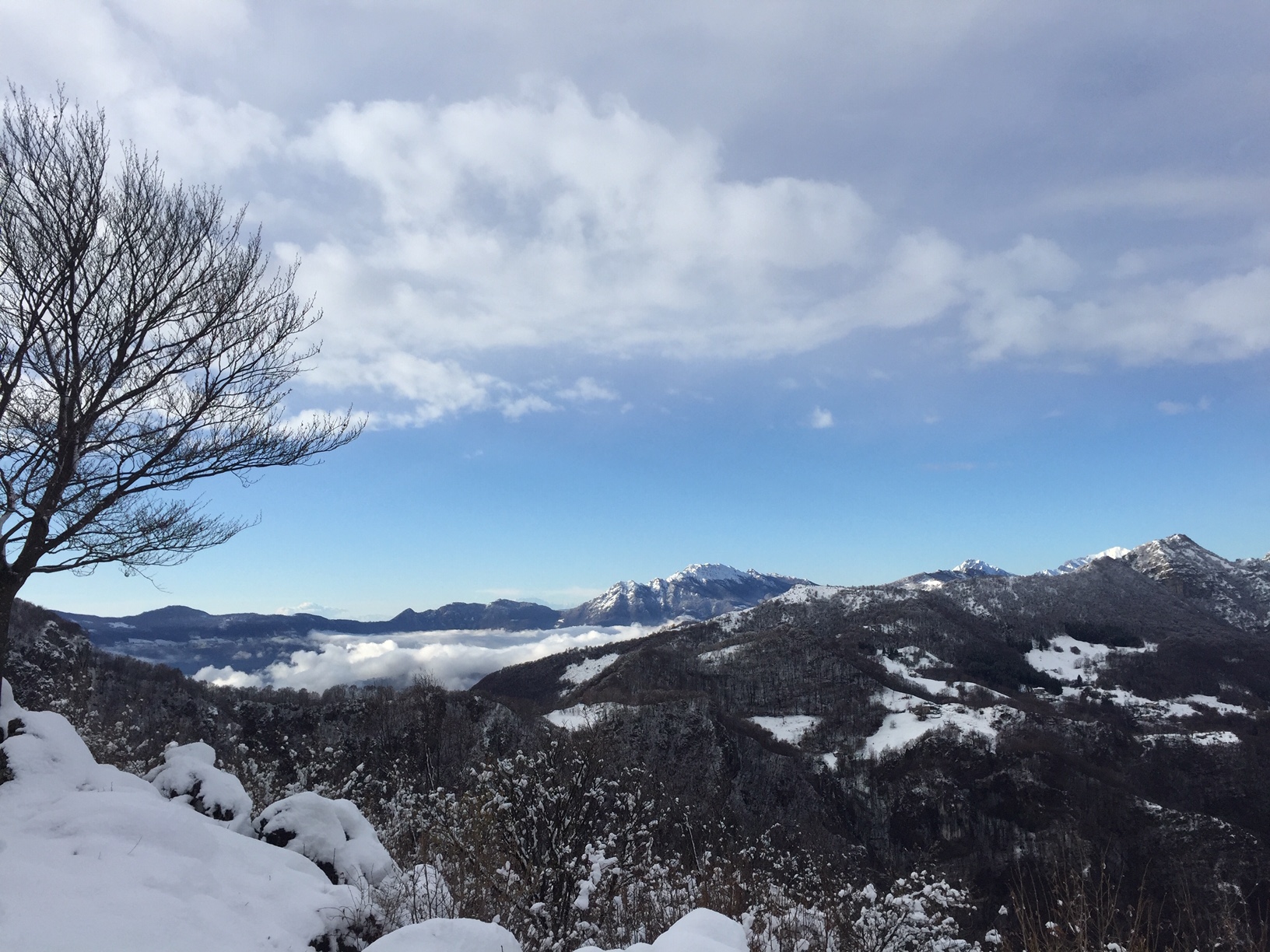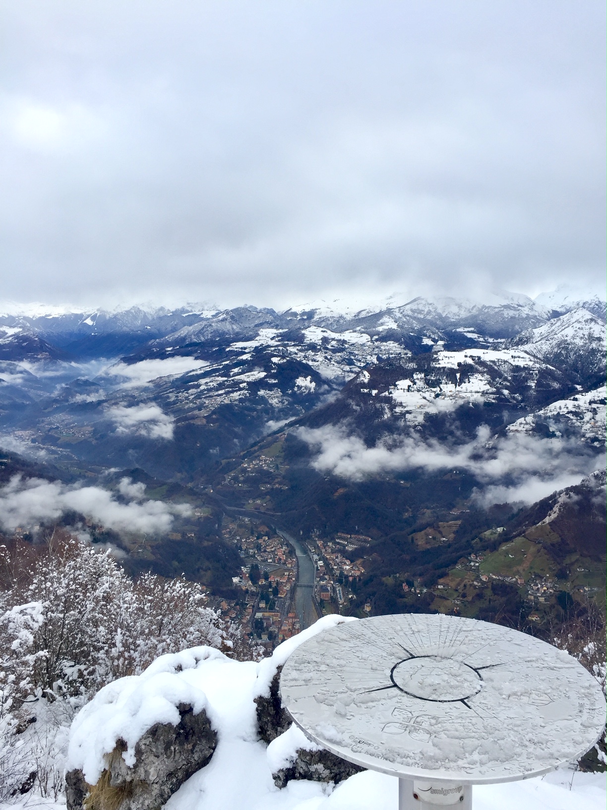 Parcheggiata l’auto alla contrada Pradonecco di Zogno (550m), imbocchiamo il sentiero cai 505, seguendo le indicazioni arriviamo alla contrada Pernice (720m) e successivamente alla contrada Sonzogno (1000m), oltrepassiamo il pascolo e proseguiamo dritti arrivando al Rifugio monte Zucco, tenendo la destra imbocchiamo il tratto di sentiero finale che, prima attraversando pratoni tra alcune baite, poi con una ripida ascesa tra rocce ci conduce alla croce e alla Bivacco GESP (1232m) a quasi 2 h dalla partenza, dal quale possiamo godere di una splendida vista a 360gradi oltre che sulla sottostante Sanpellegrino. Il tutto ricoperto dalla sottile coltre bianca della nevicata notturna.