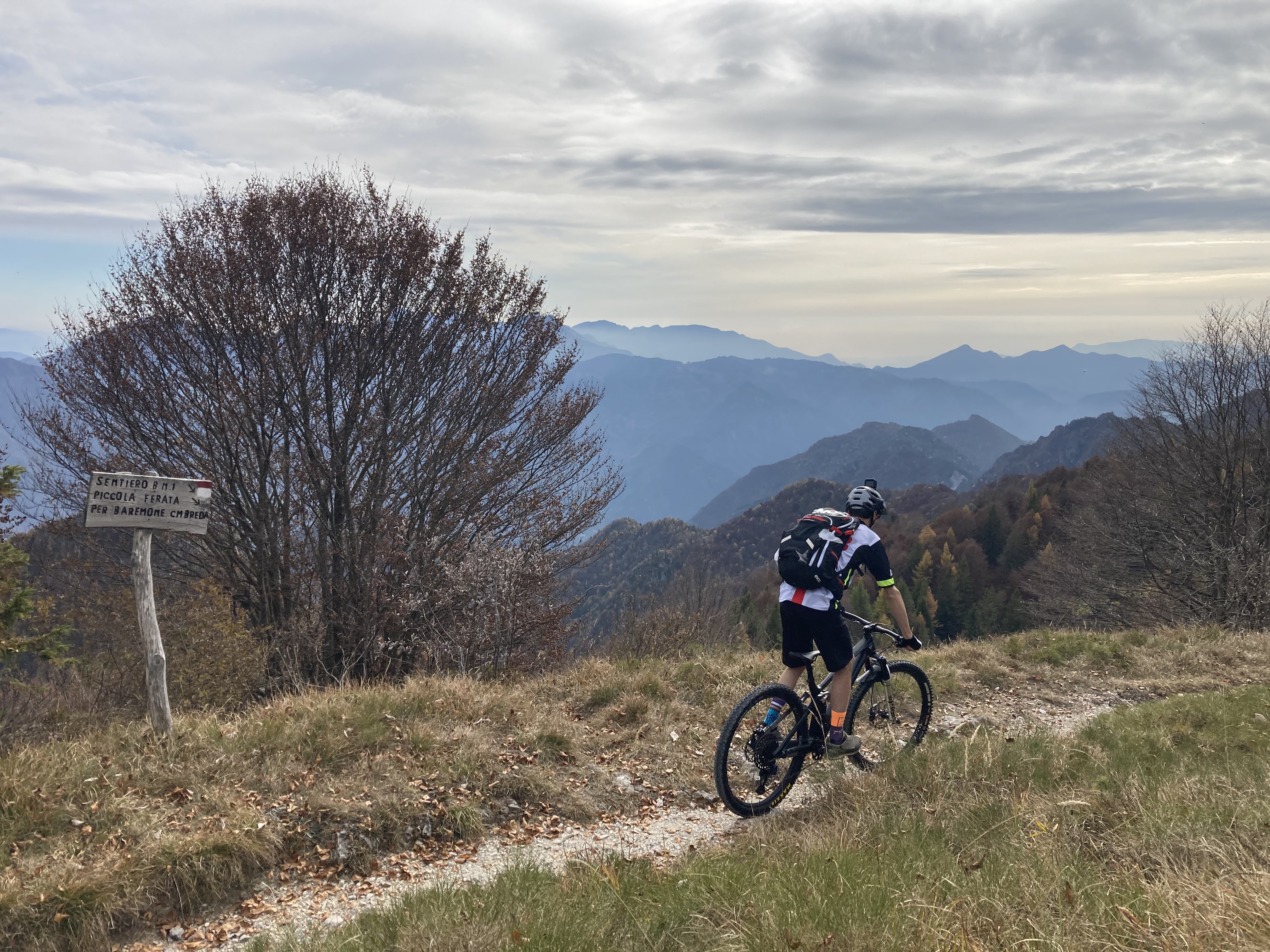 Ritorniamo al bivio per cima Breda, prendiamo il sentiero sulla sx che diventa subito un singletrack in lieve salita, da affrontare con cautela (magari bici in spalla). Tratto roccioso con piccolo tunnel nella roccia in corrispondenza della fine della prima citata ferrata. Si prosegue fino a un bivio in cui prendiamo la sinistra seguendo poi la strada forestale in lieve discesa. Arrivati all’abitazione, proseguire ancora giù per un breve tratto fino a incrociare un segnavia che ci indica cima Monte Breda sulla destra. Il pendio è decisamente ripido, ma si tratta di pochi metri, fattibili in maniera più comoda bici in spalla. Una breve e decisa salita ed eccoci alla croce che domina la ristretta cima erbosa sui 1504 m del Breda. Piccola sosta e si riparte sul sottostante sentiero.