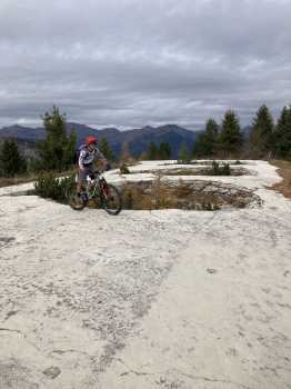Ci attende la cresta col suo singletrack a tratti esposto e alcuni saliscendi che ci obbligheranno a pedalare. Il primo tratto di discesa lambisce la parte di bosco e si presenta subito proibitivo per i più. Servono doti trialistiche non da tutti su tale pendenza e terreno scavato sdrucciolevole. Optiamo per la conduzione a mano del mezzo, pochi metri dopo il sentiero rimane stretto, ma si fa via via più docile e divertente, fino a condurci nel fitto bosco, parte in assoluto più divertente da guidare. Sentiero vario, mediamente tecnico a tratti con qualche lieve rilancio, alternato a tornantini e tratti veloci. Ci godiamo il divertimento fino a un bivio che corrisponde col termine della cresta. Ignoriamo le indicazioni per Lodrone/Ponte Caffaro, svoltando a destra, direzione Sant’Antonio/Anfo.