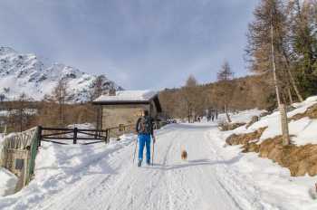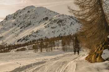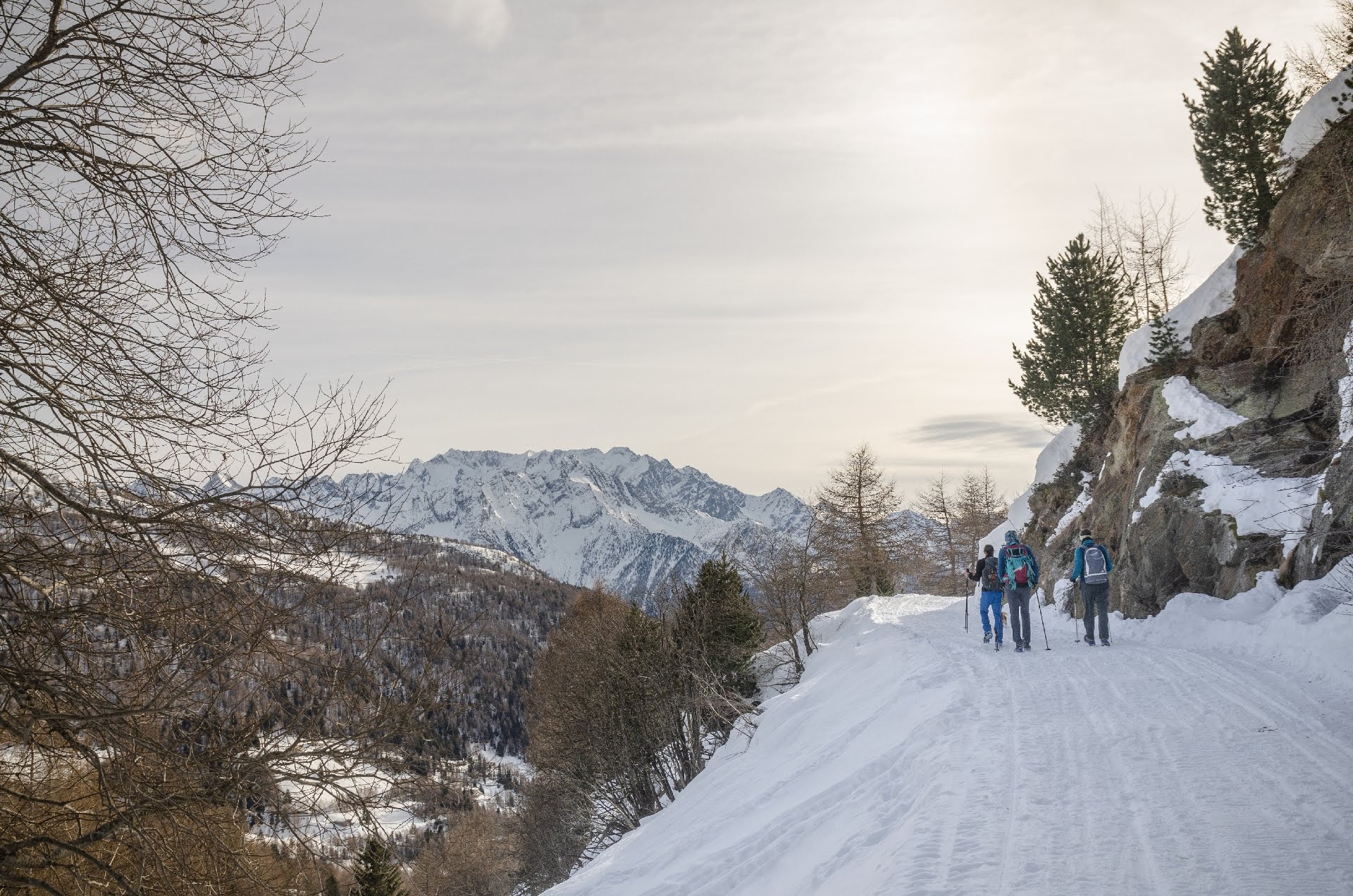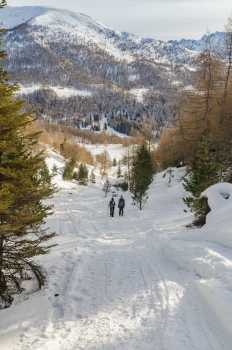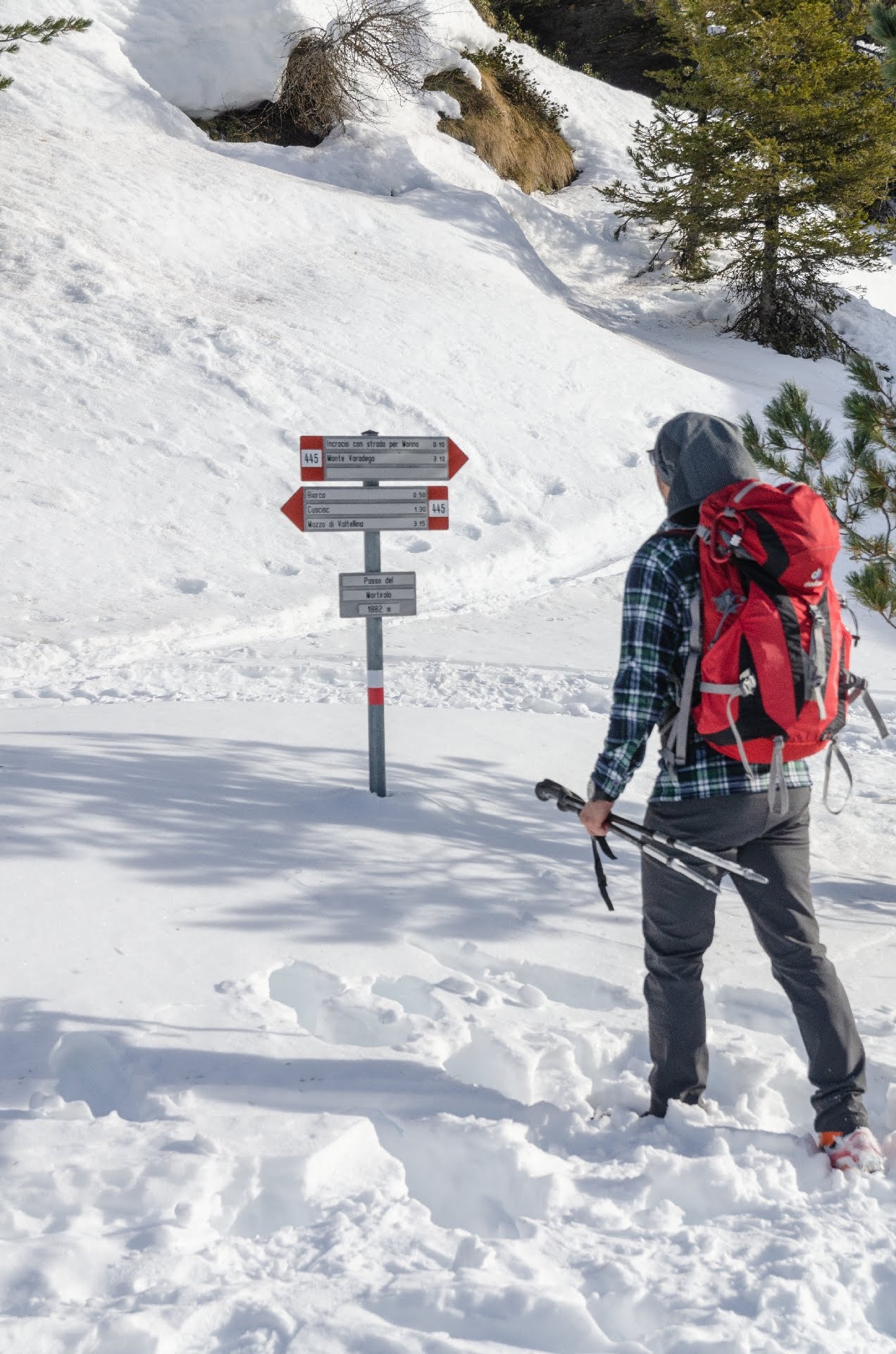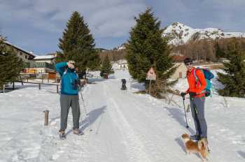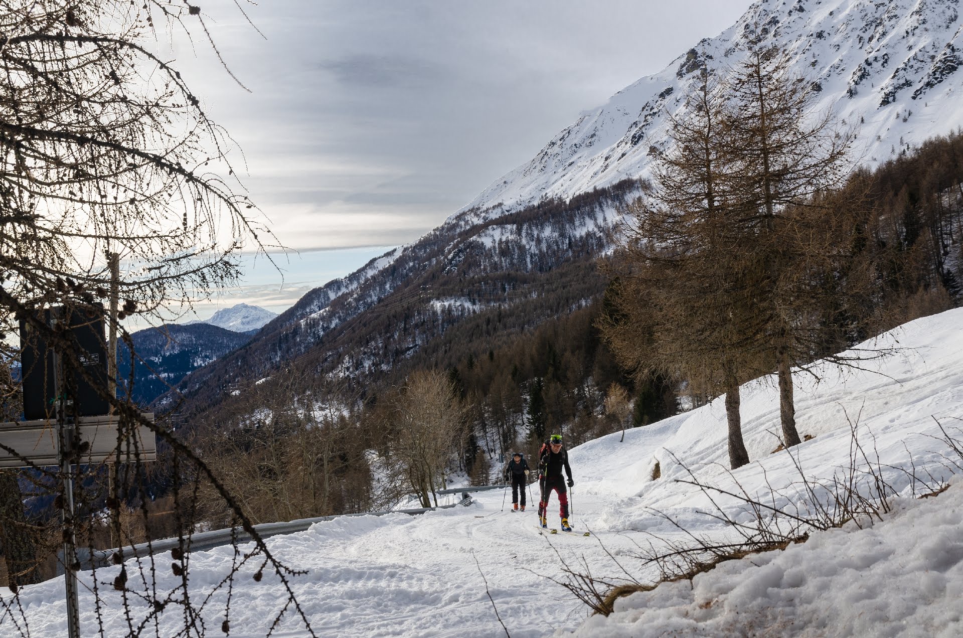 Partiti dalla vecchia mulattiera dopo l’abitato di Monno (BS), risaliamo lungo la vallata, fino a immetterci sulla strada provinciale 81 innevata, che risaliamo fino a giungere al Passo del Mortirolo (1882m), scenario di mille epiche battaglie ciclistiche.