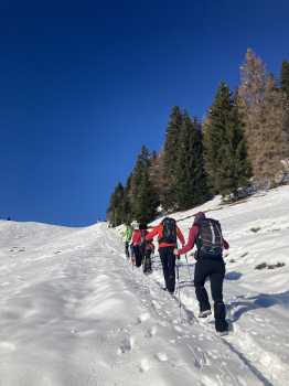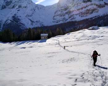 Superata la zona più alta degli ex impianti da sci, attivi dal 1972 al 1997, superiamo un breve tratto in discesa addentrandoci nel bosco, superato il quale saremo nuovamente in una radura con alcune baite, dalle quali potremo tagliare verso il rifugio Alpecorte a destra, oppure dirigerci verso passo e rifugio Branchino sulla sinistra. Optiamo per quest'ultima possibilità affrontando il ben segnalato sentiero innevato che con pendenza marcata ci porta in circa mezz'ora al rifugio e al relativo lago ghiacciato, e dopo altri dieci minuti al passo, raggiunto il quale potremo fare rientro passando stavolta dal rifugio Alpecorte dopo un buona mezz'ora. Approfittiamo della sua accogliente struttura e ospitalità per un piatto caldo, prima di imboccare la forestale che ci riporta al punto di partenza, chiudendo così un anello sicuramente sfizioso e ricco di grandiosi panorami.