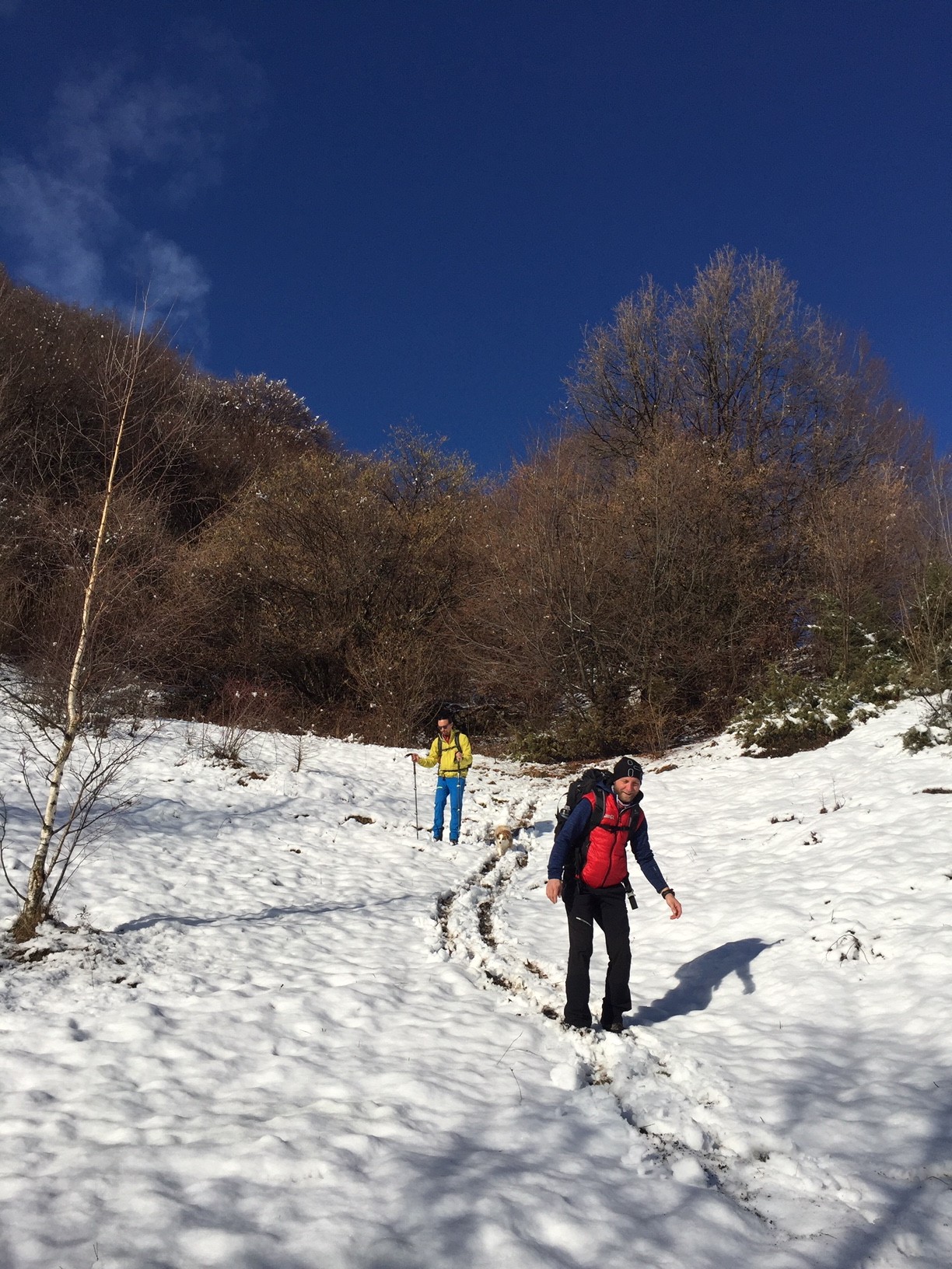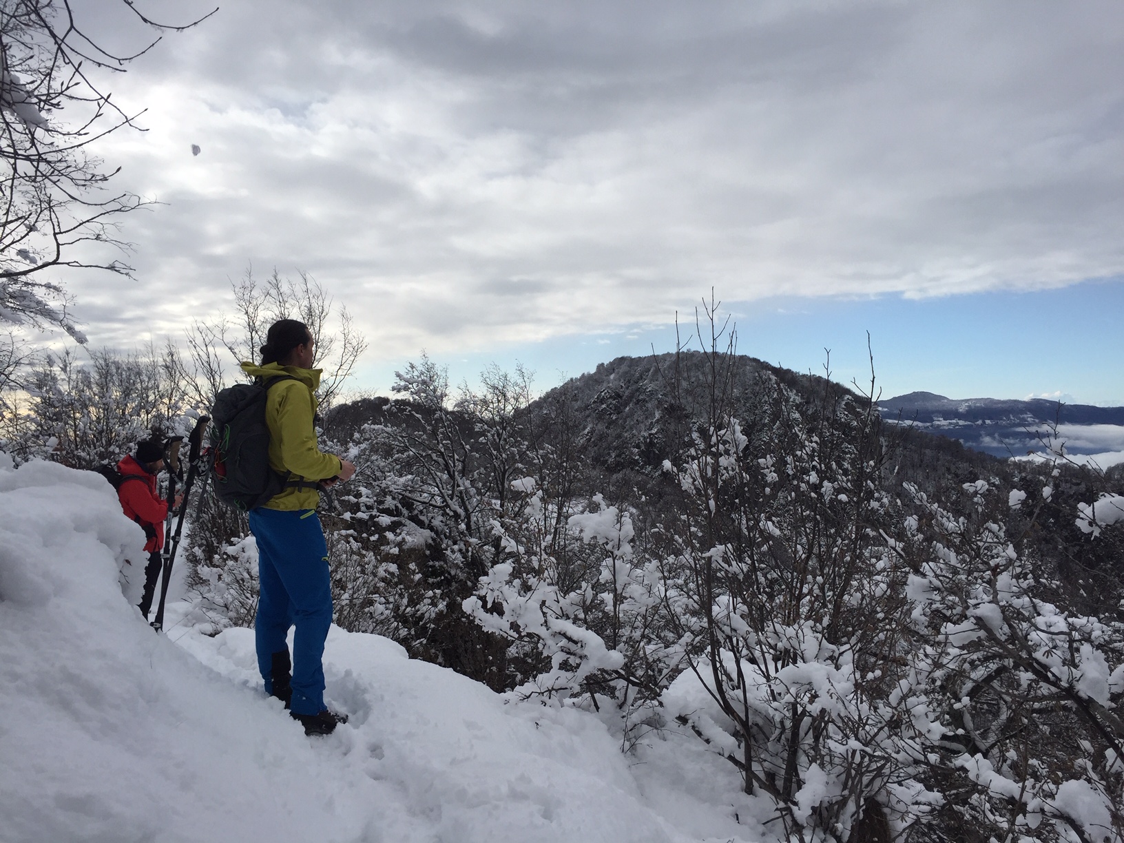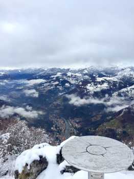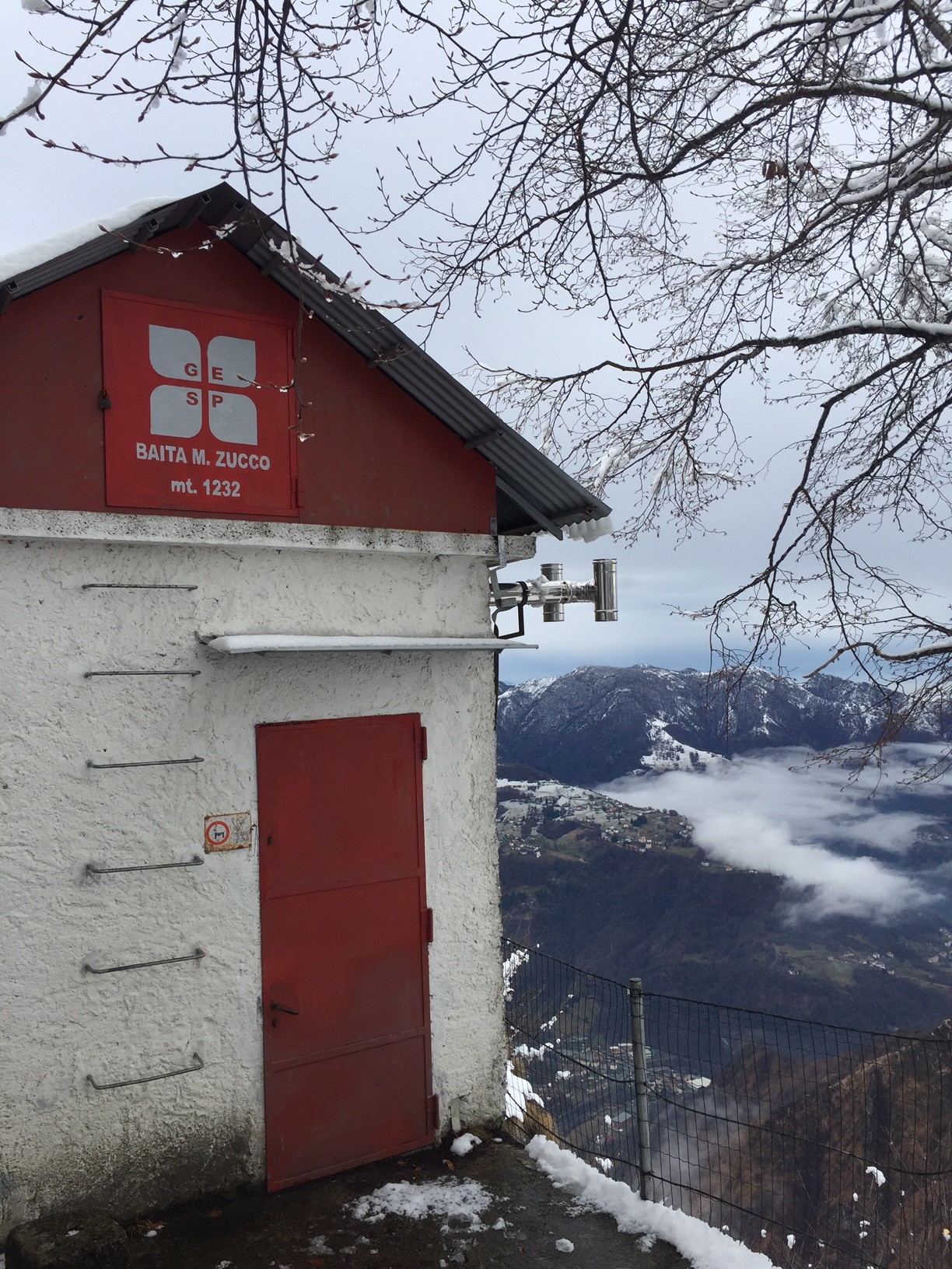 Parcheggiata l’auto alla contrada Pradonecco di Zogno (550m), imbocchiamo il sentiero cai 505, seguendo le indicazioni arriviamo alla contrada Pernice (720m) e successivamente alla contrada Sonzogno (1000m), oltrepassiamo il pascolo e proseguiamo dritti arrivando al Rifugio monte Zucco, tenendo la destra imbocchiamo il tratto di sentiero finale che, prima attraversando pratoni tra alcune baite, poi con una ripida ascesa tra rocce ci conduce alla croce e alla Bivacco GESP (1232m) a quasi 2 h dalla partenza, dal quale possiamo godere di una splendida vista a 360gradi oltre che sulla sottostante Sanpellegrino. Il tutto ricoperto dalla sottile coltre bianca della nevicata notturna.